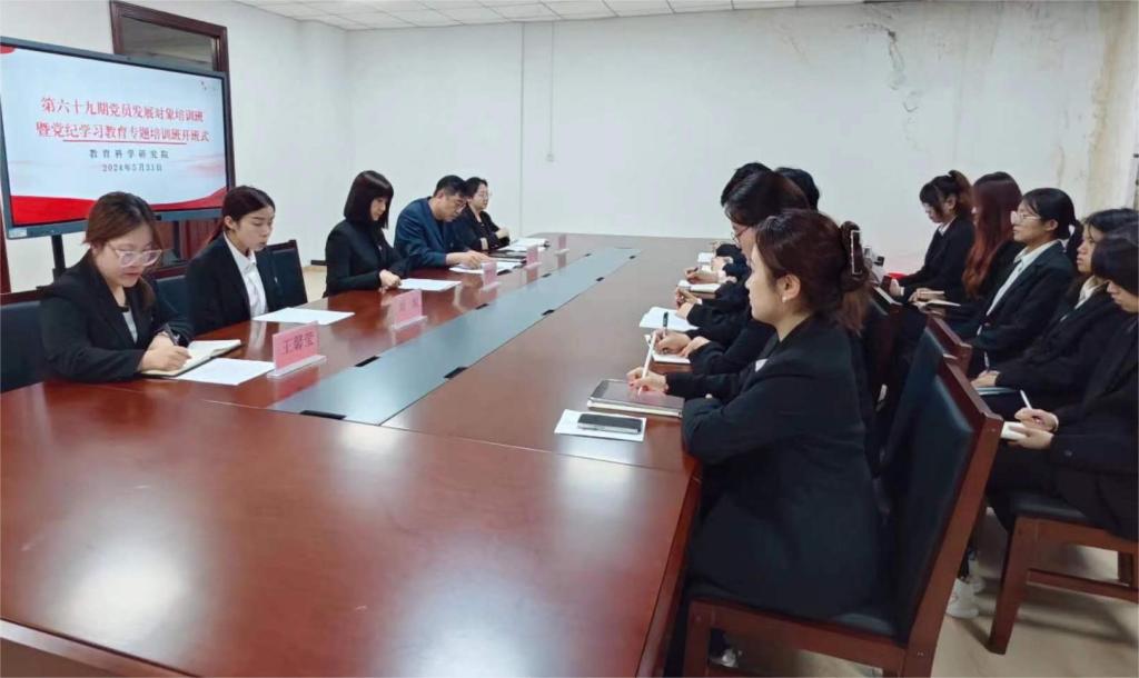 为深入学习贯彻习近平新时代中国特色社会主义思想,深入推进党纪学习教育,贯彻落实习近平总书记关于党纪学习教育的重要讲话和重要指示精神,按照《关于举办黑龙江大学第六十九期党员发展对象培训班暨党纪学习教育专题培训班的通知》要求,教育科学研究院于5月31日17时30分,在汇文楼947会议室开展第六十九期党员发展对象培训班暨党纪学习教育专题培训班开班式。教育科学研究院党总支书记綦明霞、党总支副书记屈广宁、2021级学生党支部书记王馨莹、2023级学生党支部书记宋美琪出席,本期培训班全体学员参加,会议由学院组织员刘锐主持。