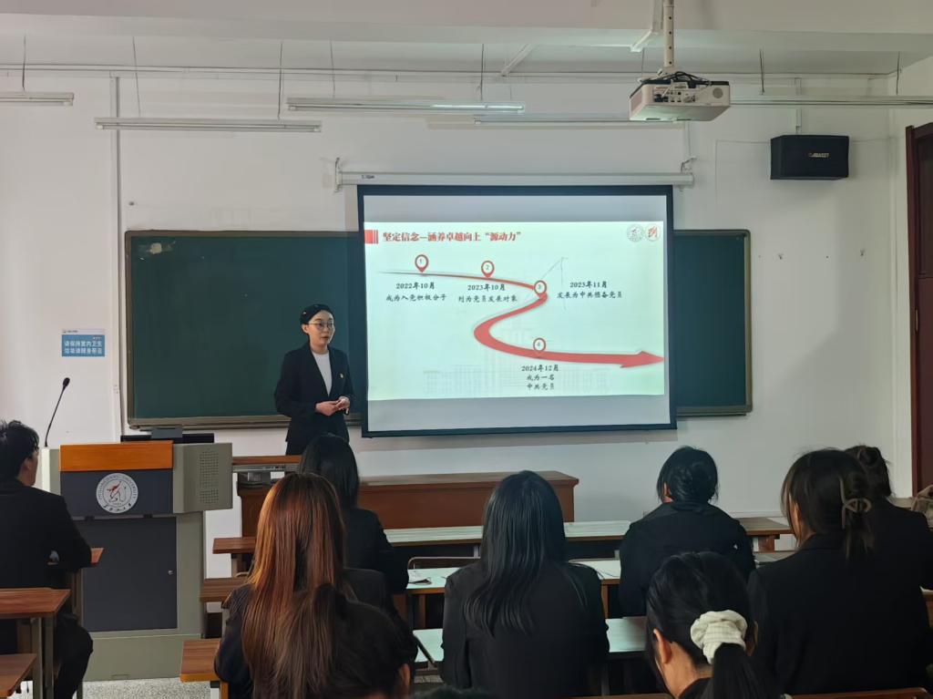 典型教学环节中,刁睿同学以《行而不辍,履践致远》为主题,从坚定理想信念、勇担时代使命、投身社会实践三个板块进行分享。作为入党积极分子应有卓越向上的“源动力”,严格要求自己的学业成绩,积极向党组织靠拢;还需有提升自身服务的“创造力”,积极投身于志愿服务,在实践中增长才干;更需有激发青春志向的“新活力”,不断释放个人潜能,发挥个人优势,推动学院发展。