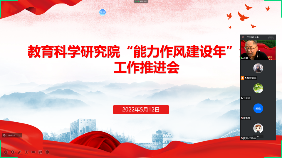 为推进广大教师提升能力、转变作风,结合《黑龙江大学“能力作风建设年”活动实施方案》要求,教育科学研究院于2022年5月12日和6月15日分别召开“能力作风建设年”工作推进会。会议由学院党总支书记金鹏主持,全院教职工参会。