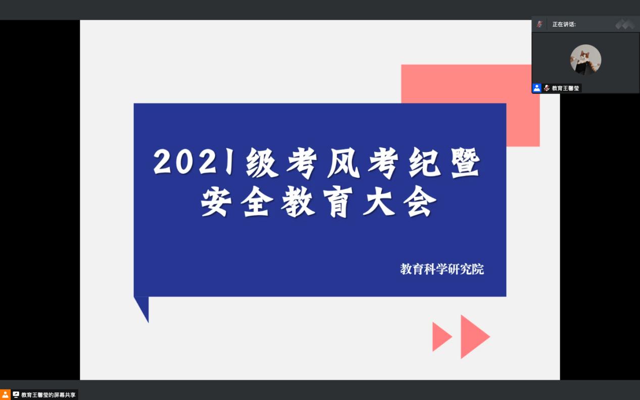 为推动近期考试的顺利进行,结合疫情防控工作的有关要求,2021年12月7日教育科学研究院于腾讯会议平台举行考风考纪教育暨安全教育大会。本次会议由各年级辅导员老师主持,全体同学参会。