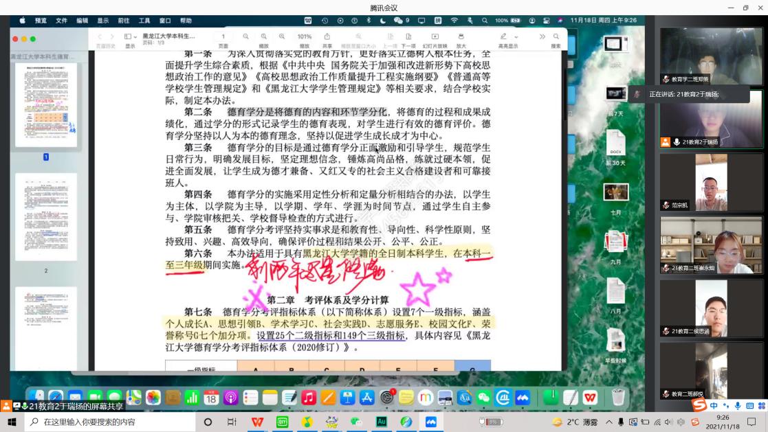 为进一步加强教育科学研究院德育管理工作,更好地落实立德树人根本任务,全面提升我院学生综合素质,根据《黑龙江大学学生管理规定》和《黑龙江大学学生德育学分修读办法(2020修订)》,教育科学研究院于2021年11月15日、17日先后在汇文楼951室开展德育学分审核负责人培训会议、在腾讯会议平台开展德育学分修读办法解读会议。会议分别由2021级辅导员王馨莹老师、班级德育学分审核负责人主持,全体2021级同学参会。