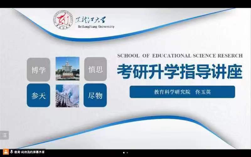 随后,主讲人佟玉英副院长就考研情况进行综合分析,重点阐述考研容易放弃的因素,分享考研信息渠道获得的途径,就如何选择考研目标院校,给出了专业的建议,佟老师强调要综合自身能力,合理制定考研目标。此外,佟老师对学硕、专硕以及全日制和非全日制等依次进行讲解,对教育学科学研究院的师资力量、人才培养目标、专业特色、课程设置、培养过程和招生情况等方面进行介绍,并欢迎同学们报考本校研究生。