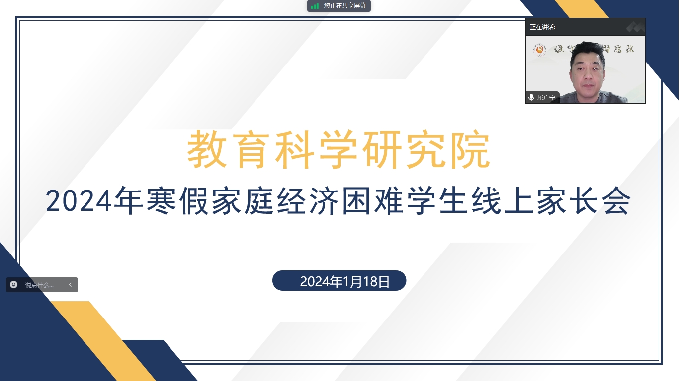 教育科学研究院于2024年1月18日18时30分在腾讯会议平台开展家庭经济困难学生家长会,2021级辅导员王馨莹主持会议,院党总支副书记屈广宁、各年级辅导员、家庭经济困难学生及其家长参会。会议伊始,2022级辅导员闵诗尧对家庭经济困难学生及家长表达了亲切的关怀和问候,向学生及家长宣传了国家及学校的资助政策,介绍了包括奖学金和助学金在内的我校本科学生资助工作体系及学生资助政策的相关情况,详细介绍了学校学院在学生日常事务管理服务、家庭经济困难学生教育帮扶等方面工作开展情况,讲解了家庭经济困难学生认定与动态管理的工作原则。随后,学院的党总支副书记屈广宁与家长进行了面对面的沟通交流,表达了对学生的嘱托和期盼,希望家庭经济困难学生注重自身学业,自立自强,不断提高个人知识水平和能力。同时表明学校和学院对家庭经济困难学生的关切与照顾,强调家庭经济困难学生要加强自身自觉性,避免生活中的过度消费。最后提醒低年级的学生应把握住时间充实自己,多学习,做好长远规划,高年级学生找准方向,明确目标,脚踏实地地努力前进。