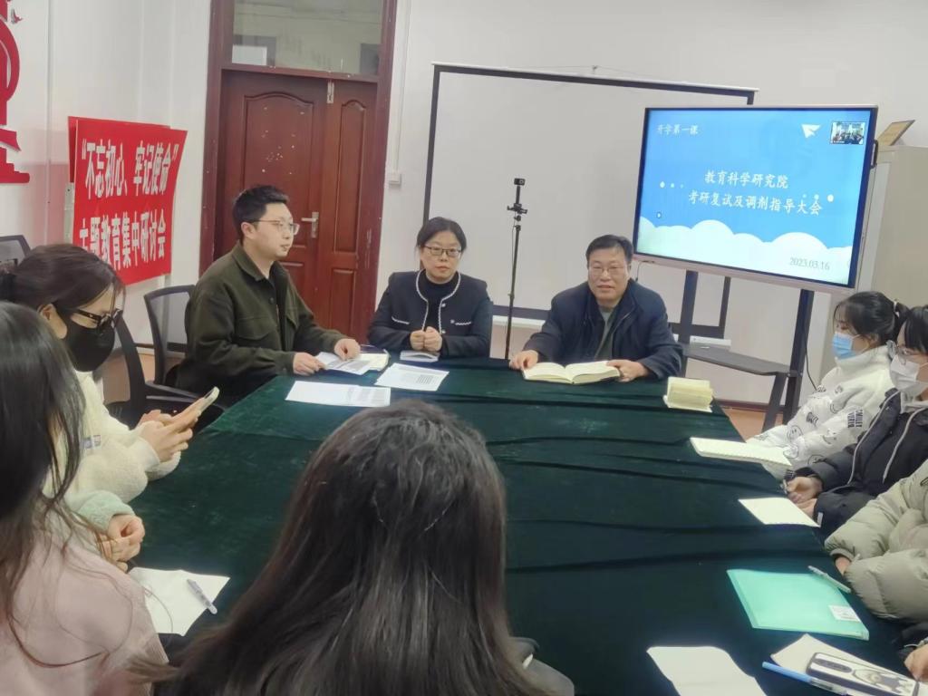 为确保2023届学生考研复试及调剂工作顺利开展,帮助2023届毕业生解决实际需求,提高复试和调剂成功率,教育科学研究院于2023年3月16日18时在汇文楼959召开考研复试及调剂指导大会。本次会议由2023届辅导员老师闵诗尧主持,学院党总支副书记付丽、学院副院长佟玉英,应用心理学专业教师郝春东、王殿春出席,2023届考研复试及调剂学生参加会议。