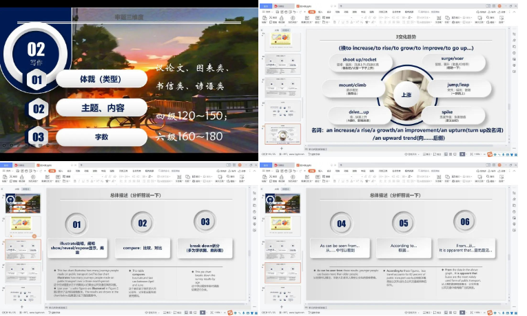 紧接着她从审题的三个维度为大家讲述写作类题型,包括了四种常见的体裁类型、六种总体描述的方式、常见的六种涉及主题、两类变化趋势和与字数要求。她表示,作文部分可分为议论文、图表类、书信类、谚语类四大写作类型,写作需要新鲜高级的表达,因此在写作过程中则应熟练运用各大从句,虚拟语气,强调句,倒装,被动语态等高级句式,把握好整体的结构逻辑,注意卷面的整洁性和布局。她表示写出高质量且赏心悦目的作文,是依靠平时的积累和努力,通过不断练习来提升。