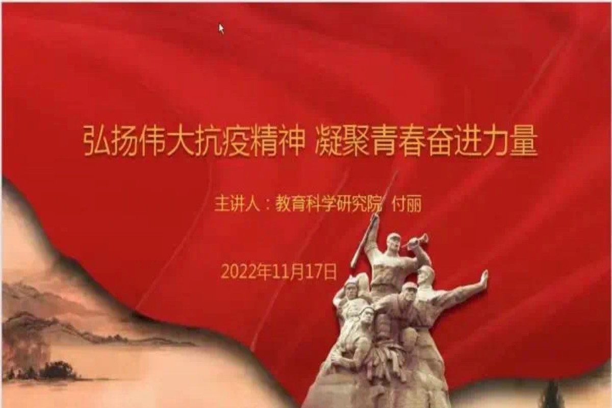 接下来,学院党总支副书记付丽以“弘扬伟大抗疫精神,凝聚青春奋进力量”为主题,结合11月3日我校疫情防控工作,向大家展现了疫情防控期间青年逆行一线、舍我其谁的责任担当。她强调,党员要充分发挥先锋模范作用,带头遵守各项防疫要求,同时要深入学习贯彻党的二十大精神,以实际行动守护校园安全。