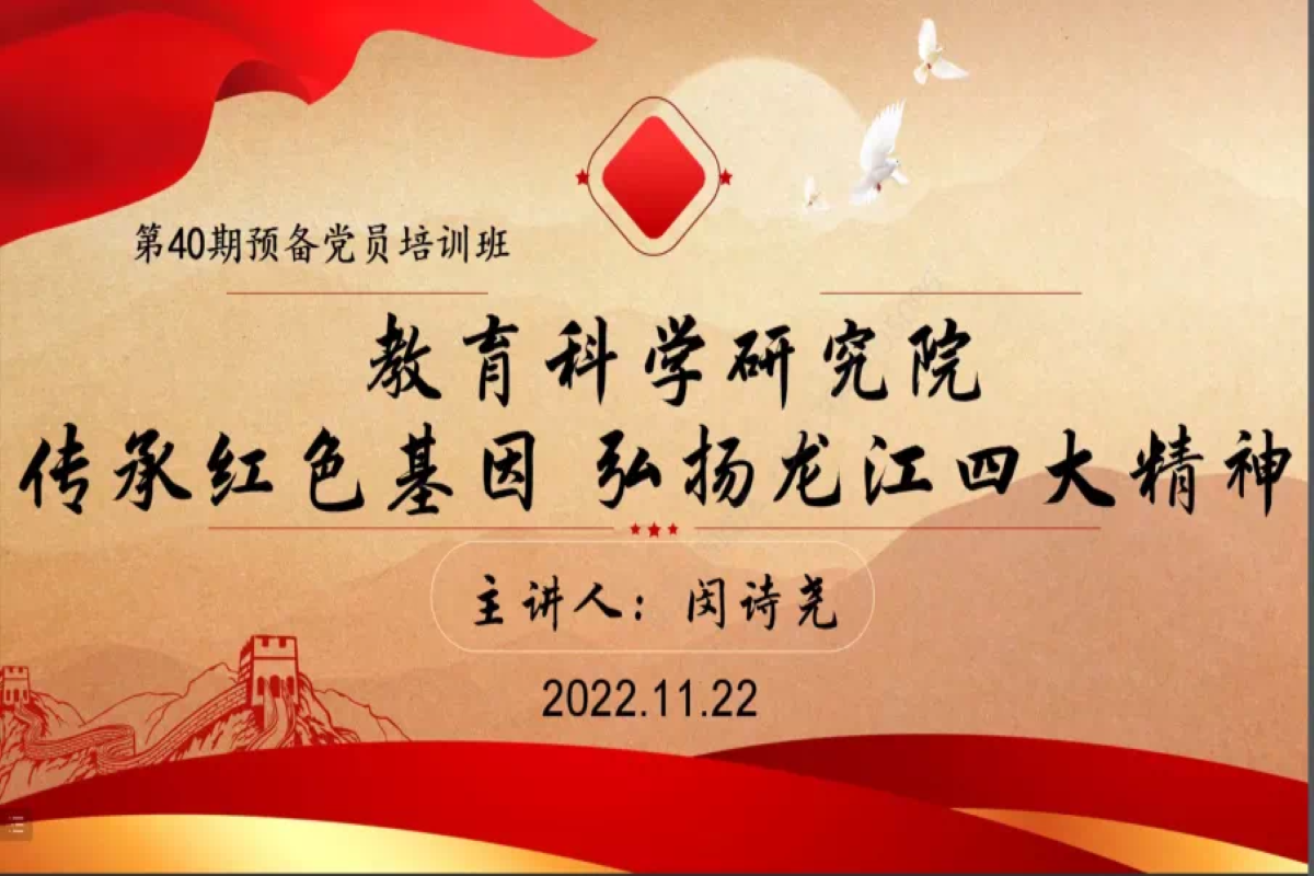 最后,学院团委书记闵诗尧以“传承红色基因,弘扬龙江‘四大精神’”为主题,对龙江“四大精神”的内容及精神内涵做出详细讲解。闵老师指出作为学生党员,大家要学习并弘扬龙江“四大精神”,坚定理想信念,增强党性原则,努力在实践中磨砺意志、增长才干,为实现第二个百年奋斗目标、实现中华民族伟大复兴的中国梦贡献青春力量。