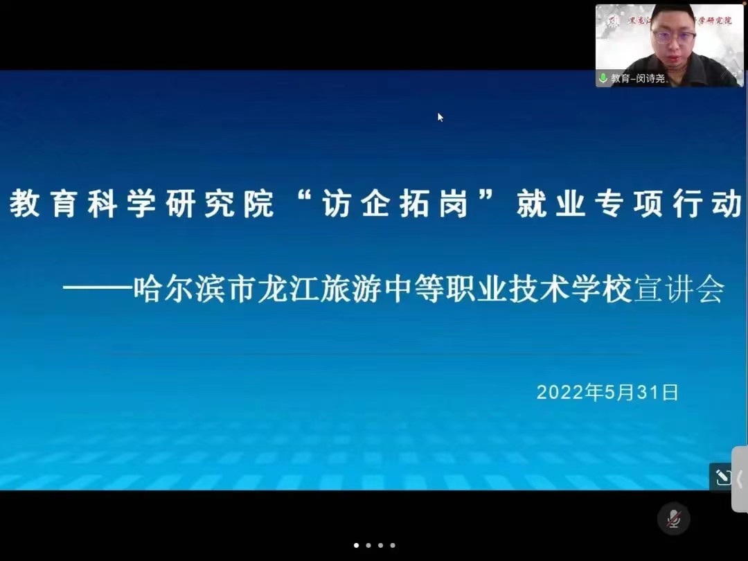 为进一步推动学院就业工作,帮助2022届毕业生实现充分就业。黑龙江大学教育科学研究院和哈尔滨市龙江旅游中等职业技术学校于2022年5月31日18时通过腾讯会议开展线上宣讲会。本次会议由2019级辅导员闵诗尧主持,学院党总支书记金鹏,院长王世红,学院党总支副书记付丽,副院长佟玉英,2018级、2020级辅导员梁曼,2021级辅导员王馨莹,以及哈尔滨市龙江旅游中等职业技术学校人事主管商振宇出席参加,各年级学生参会。