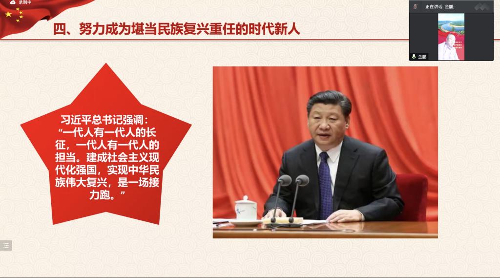 金鹏书记以“什么是新时代?”为切入点,向大家阐述新时代下我国改革发展和全面实现现代化的历史方位,进一步明确了新时代的内涵和意义。他指出,同学们正是新时代的建设者,需要充分认识到国家形势、时代格局还有中国与世界的关系,必须牢牢把握实现民族复兴这一时代主题,以昂扬的斗志和无畏的精神,做有远大理想抱负、深厚家国情怀和伟大创造力的青年,将个人梦想与实现中华民族伟大复兴的中国梦紧密结合,不断为民族复兴大业添砖加瓦。