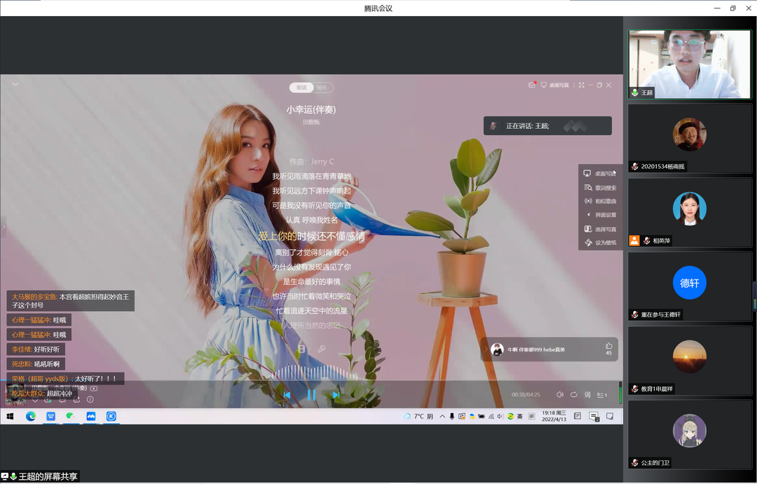 活动现场异常火爆,选手们满怀激情,用他们的奇妙歌声感染着观众的心灵,评论区观众热情高涨,纷纷为线上选手加油。姜倩同学的《我要你》温柔舒缓、徐烨成同学的《如愿》悠扬婉转、窦品兰同学的《开心往前飞》热情洋溢、王超同学的《小幸运》低沉动听,贺羽佳同学的《Holy》风格鲜明、王骏铮同学的《总有一天你会出现在我身边》余音缭绕、申晨祥同学和汪先洋同学合唱的《好汉歌》清脆淳朴、气势磅礴,将活动的气氛推向高潮,节目中的歌曲众多,风格也各不相同,有温柔抒情的情歌、有活泼欢脱的儿歌、还有别饶风致的说唱、多才多艺的选手们风格百变,惊艳四座......