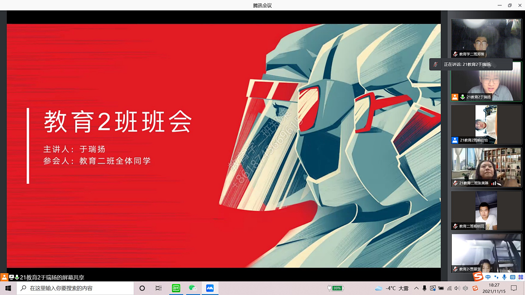 为了进一步帮助2021级新生更加科学地规划大学生活,明确学习目的并树立奋斗目标,2021年11月15日18时30分教育科学研究院于腾讯会议平台召开第二次班会,班会由2021级各班班长主持,各班班长、生活委员、学习委员主讲。本次班会共分为三个部分,分别为集体学习《黑龙江大学学生管理规定》、强调安全教育问题、总结并严肃纪律问题。