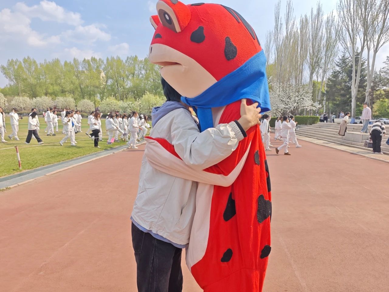 “蛙蛙”热情迎接参与者,通过拥抱、合影和操场游戏,迅速拉近与同学们及小朋友的距离,并送上“天天开心”的暖心祝福。