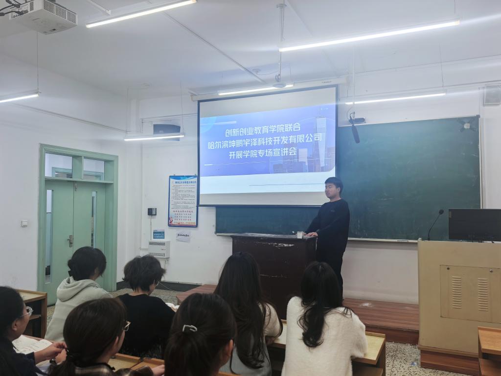 会议伊始,哈尔滨坤鹏宇泽科技开发有限公司负责人首先向在场学生介绍企业基本情况,涵盖公司业务布局、技术研发方向等内容。随后,该负责人详细讲解岗位详情及未来规划,包括本次招聘的技术岗、运营岗等岗位要求以及薪资待遇等。他提到,公司专注于智能硬件研发与行业数字化解决方案,已推出工业物联网终端、智慧校园管理系统等核心产品,合作客户覆盖东北区域多家企事业单位;同时将持续深耕东北数字经济领域,为员工提供广阔发展空间。最后,负责人表示希望校企双方能够长期合作,加强人才培养,实现双方共赢。