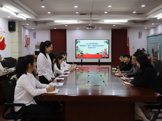 于4月8日在四号楼地下会议室召开2026年春季学期“民族团结一家亲,融情交流共成长”主题座谈会。会议由学院辅导员周子林主持,学院党委副书记屈广宁、校党委学生工作部(学生处、武装部)少数民族专职辅导员麦麦提伊敏·斯迪克及学院各年级辅导员出席,学院各年级学生代表参加。
